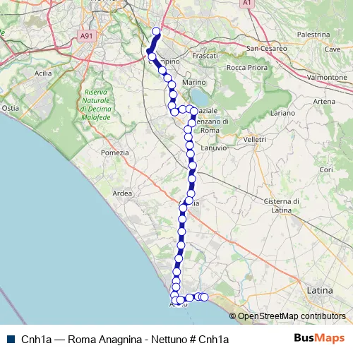 The first stop of the Cnh1a bus route is Roma | Anagnina (Metro A) # f3583 and the last stop is Nettuno | Autostazione # f00094. Cnh1a (Roma Anagnina - Nettuno # Cnh1a) is operational during tutti i giorni.