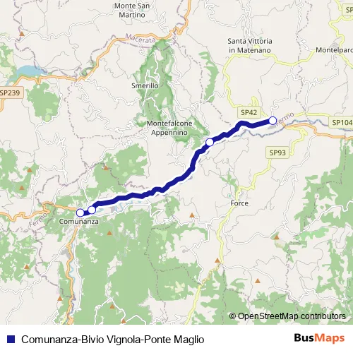 The first stop of the Comunanza-Bivio Vignola-Ponte Maglio bus route is Comunanza - VIA Roma and the last stop is Ponte Maglio - Santa Vittoria IN Matenan. Comunanza-Bivio Vignola-Ponte Maglio (Comunanza-Bivio Vignola-Ponte Maglio) is operational during tutti i giorni.