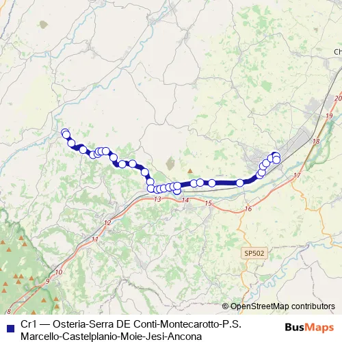 The first stop of the Cr1 bus route is Serra DE Conti (Porta Croce) and the last stop is Jesi (Capolinea). Cr1 (Osteria-Serra DE Conti-Montecarotto-P.S. Marcello-Castelplanio-Moie-Jesi-Ancona) is operational during tutti i giorni.