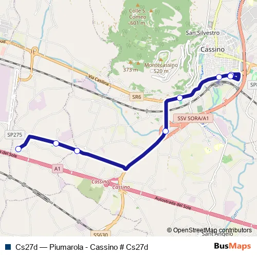 The first stop of the Cs27d bus route is Villa S. Lucia | Piumarola # f8035 and the last stop is Cassino | Viale Garigliano Via Volturno # f4412. Cs27d (Piumarola - Cassino # Cs27d) is operational during tutti i giorni.
