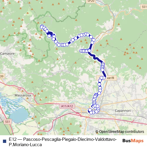 The first stop of the E12 bus route is Pascoso Capolinea and the last stop is Piegaio 2. E12 (Pascoso-Pescaglia-Piegaio-Diecimo-Valdottavo-P.Moriano-Lucca) is operational during tutti i giorni.