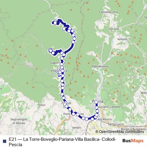 The first stop of the E21 bus route is La Torre Capolinea and the last stop is Pescia. E21 (La Torre-Boveglio-Pariana-Villa Basilica- Collodi-Pescia) is operational during tutti i giorni.