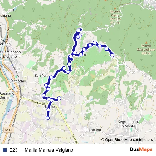 The first stop of the E23 bus route is Colle Matraia Capolinea and the last stop is Marlia Mercato 2. E23 (Marlia-Matraia-Valgiano) is operational during tutti i giorni.