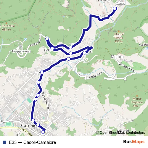 The first stop of the E33 bus route is Camaiore P.Za Romboni 2 and the last stop is Casoli 2. E33 (Casoli-Camaiore) is operational during nel fine settimana.