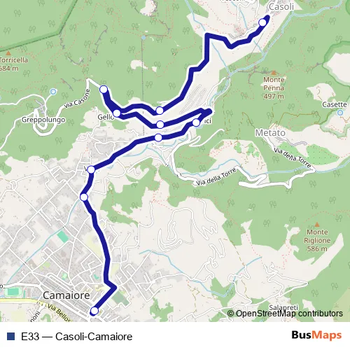 The first stop of the E33 bus route is Casoli 1 and the last stop is Camaiore P.Za Romboni 2. E33 (Casoli-Camaiore) is operational during tutti i giorni.