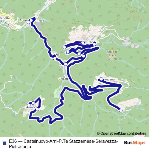 The first stop of the E36 bus route is Pontestazzemese and the last stop is Farnocchia. E36 (Castelnuovo-Arni-P.Te Stazzemese-Seravezza-Pietrasanta) is operational during tutti i giorni.