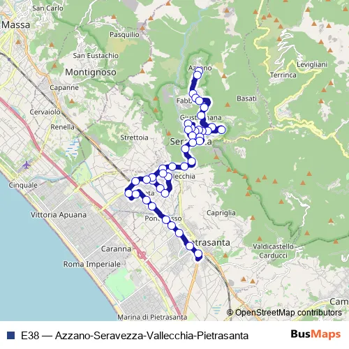 The first stop of the E38 bus route is Azzano Capolinea P.Za Tarabella and the last stop is Pietrasanta Terminal 2. E38 (Azzano-Seravezza-Vallecchia-Pietrasanta) is operational during tutti i giorni.