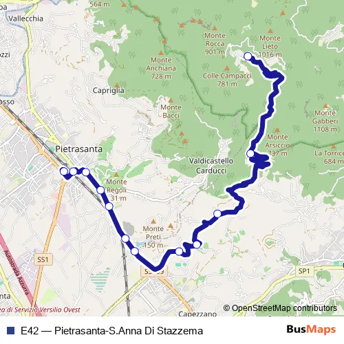 The first stop of the E42 bus route is S.Anna Stazzema and the last stop is Pietrasanta Terminal 2. E42 (Pietrasanta-S.Anna Di Stazzema) is operational during tutti i giorni.