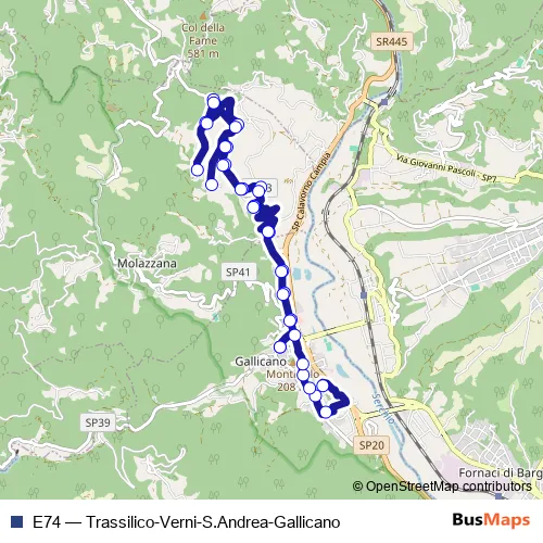 The first stop of the E74 bus route is Gallicano Scuole and the last stop is Gallicano Capolinea. E74 (Trassilico-Verni-S.Andrea-Gallicano) is operational during tutti i giorni.