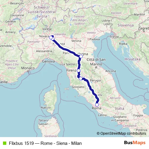 Click here to view the nearest Flixbus 1519 - Rome - Siena - Milan bus stop.