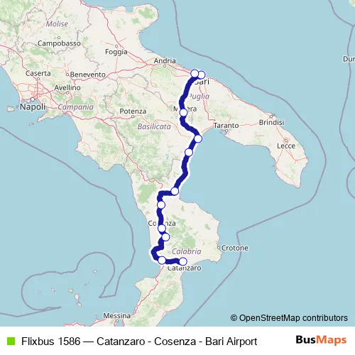 Bus Flixbus 1586 - Catanzaro - Cosenza - Bari Airport in Bari: Stops & Timetable