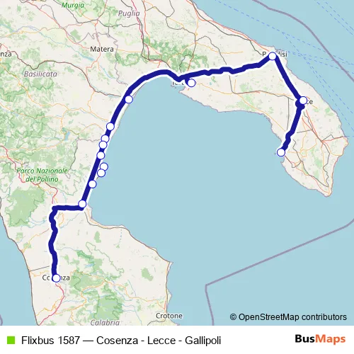 The first stop of the Flixbus 1587 bus route is Gallipoli and the last stop is Cosenza (Autostazione). Flixbus 1587 (Cosenza - Lecce - Gallipoli) is operational during nel fine settimana.