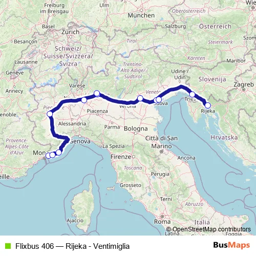 The first stop of the Flixbus 406 bus route is Ventimiglia and the last stop is Rijeka bus station. Flixbus 406 (Rijeka - Ventimiglia) is operational during tutti i giorni.