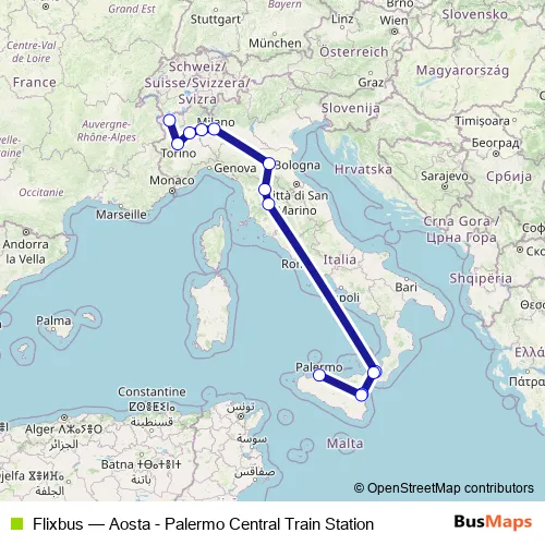 The first stop of the Flixbus bus route is Aosta and the last stop is Palermo Terminal Bus. Flixbus (Aosta - Palermo Central Train Station) is operational during tutti i giorni.