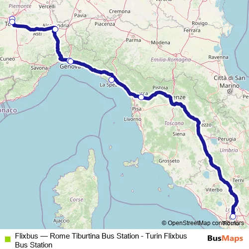 The first stop of the Flixbus bus route is Turin Corso Vittorio Emanuele Ii and the last stop is Rome Tiburtina Bus station. Flixbus (Rome Tiburtina Bus Station - Turin Flixbus Bus Station) is operational during tutti i giorni.
