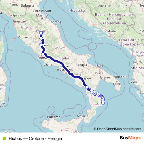 The first stop of the Flixbus bus route is Crotone bus station and the last stop is Perugia Piazza Partigiani. Flixbus (Crotone - Perugia) is operational during tutti i giorni.