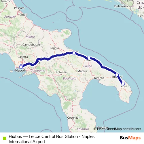 The first stop of the Flixbus bus route is Naples Capodichino International Airport and the last stop is Lecce Central Bus Station. Flixbus (Lecce Central Bus Station - Naples International Airport) is operational during tutti i giorni.