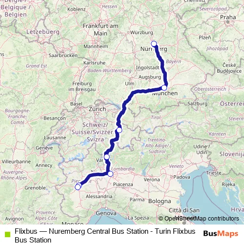 The first stop of the Flixbus bus route is Nuremberg Central Bus Station and the last stop is Turin Corso Vittorio Emanuele Ii. Flixbus (Nuremberg Central Bus Station - Turin Flixbus Bus Station) is operational during tutti i giorni.
