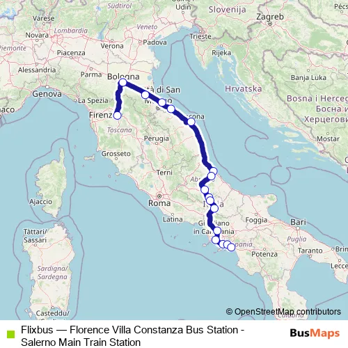 The first stop of the Flixbus bus route is Florence Villa Costanza and the last stop is Salerno Piazza delle Concordia. Flixbus (Florence Villa Constanza Bus Station - Salerno Main Train Station) is operational during tutti i giorni.