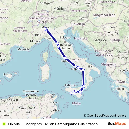 The first stop of the Flixbus bus route is Agrigento Piazzale Vittorio Emanuele and the last stop is Milan Lampugnano Bus Station.. Flixbus (Agrigento - Milan Lampugnano Bus Station) is operational during tutti i giorni.