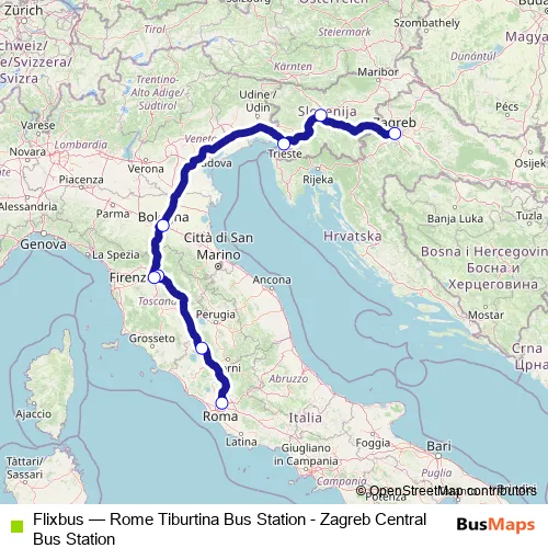 The first stop of the Flixbus bus route is Rome Tiburtina Bus station and the last stop is Zagreb Central Bus Station. Flixbus (Rome Tiburtina Bus Station - Zagreb Central Bus Station) is operational during tutti i giorni.