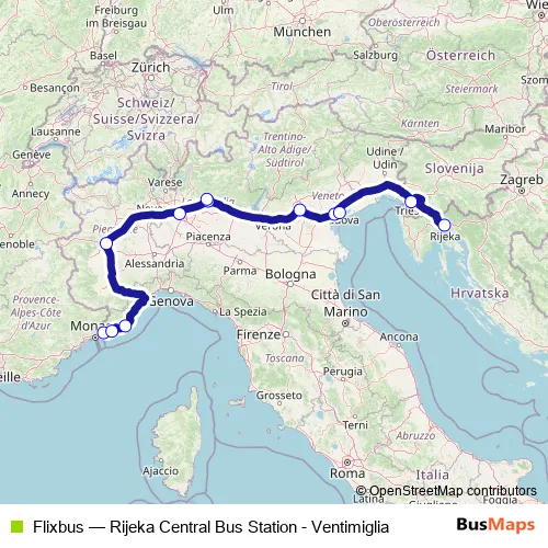 The first stop of the Flixbus bus route is Ventimiglia Piazza della Costituente and the last stop is Rijeka Central Bus Station. Flixbus (Rijeka Central Bus Station - Ventimiglia) is operational during tutti i giorni.