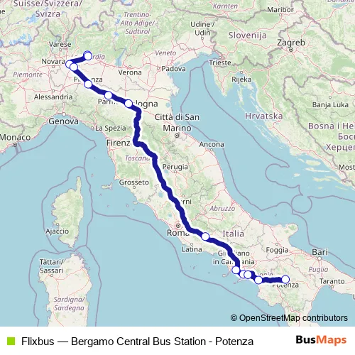 The first stop of the Flixbus bus route is Bergamo Central Bus Station Bartolomeo Bono and the last stop is Potenza Viale del Basento. Flixbus (Bergamo Central Bus Station - Potenza) is operational during tutti i giorni.