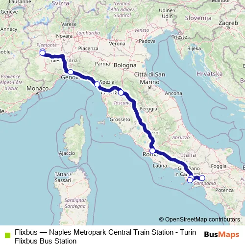 The first stop of the Flixbus bus route is Turin Corso Vittorio Emanuele Ii and the last stop is Naples Metropark Central Parking. Flixbus (Naples Metropark Central Train Station - Turin Flixbus Bus Station) is operational during tutti i giorni.