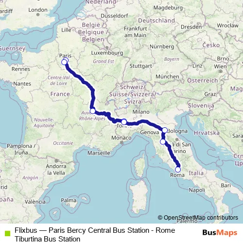 The first stop of the Flixbus bus route is Paris Gare de Bercy Seine and the last stop is Rome Tiburtina Bus station. Flixbus (Paris Bercy Central Bus Station - Rome Tiburtina Bus Station) is operational during tutti i giorni.
