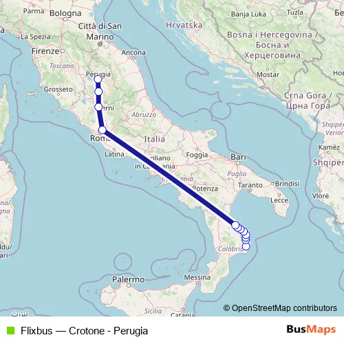 The first stop of the Flixbus bus route is Mirto Crosia and the last stop is Crotone. Flixbus (Crotone - Perugia) is operational during nel fine settimana.