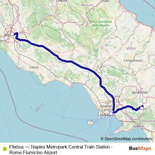 The first stop of the Flixbus bus route is Rome Tiburtina Bus station and the last stop is Avellino Via Fontanatetta. Flixbus (Naples Metropark Central Train Station - Rome Fiumicino Airport) is operational during nel fine settimana.