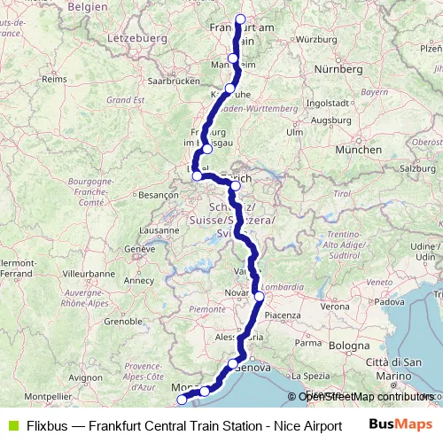 The first stop of the Flixbus bus route is Milan Lampugnano Bus Station. and the last stop is Frankfurt Central Train Station (Stuttgarter Str.). Flixbus (Frankfurt Central Train Station - Nice Airport) is operational during nel fine settimana.