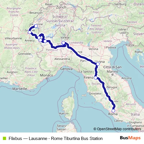 The first stop of the Flixbus bus route is Lausanne Bus Station and the last stop is Rome Tiburtina Bus station. Flixbus (Lausanne - Rome Tiburtina Bus Station) is operational during tutti i giorni.