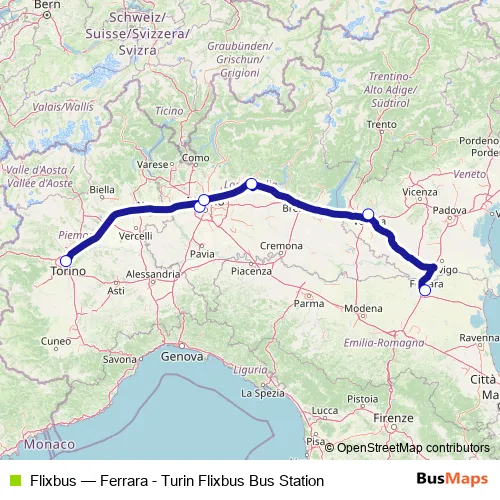 The first stop of the Flixbus bus route is Turin Corso Vittorio Emanuele Ii and the last stop is Ferrara Train Station. Flixbus (Ferrara - Turin Flixbus Bus Station) is operational during tutti i giorni.