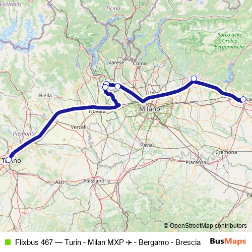 The first stop of the Flixbus 467 bus route is Brescia (Saia bus station) and the last stop is Turin (Vittorio Emanuele). Flixbus 467 (Turin - Milan MXP ✈ - Bergamo - Brescia) is operational during tutti i giorni.