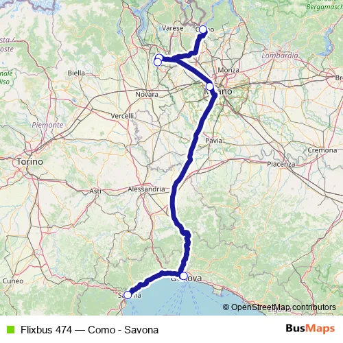 The first stop of the Flixbus 474 bus route is Como and the last stop is Savona (Stazione Fs). Flixbus 474 (Como - Savona) is operational during nel fine settimana.