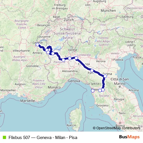 The first stop of the Flixbus 507 bus route is Geneva (central bus station) and the last stop is Pisa (Pisamover via San Giusto/Aurelia). Flixbus 507 (Geneva - Milan - Pisa) is operational during tutti i giorni.