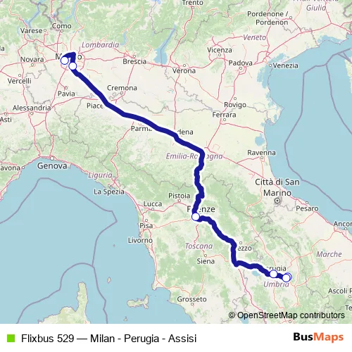 The first stop of the Flixbus 529 bus route is Assisi (Piazza Unità d'Italia) and the last stop is Milan (Lampugnano bus station). Flixbus 529 (Milan - Perugia - Assisi) is operational during tutti i giorni.