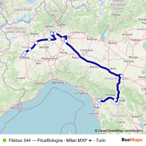The first stop of the Flixbus 544 bus route is Pisa (Pisamover via San Giusto/Aurelia) and the last stop is Turin (Vittorio Emanuele). Flixbus 544 (Pisa/Bologna - Milan MXP ✈ - Turin) is operational during nel fine settimana.
