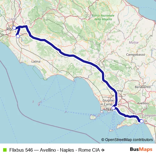 The first stop of the Flixbus 546 bus route is Rome Ciampino Airport and the last stop is Avellino. Flixbus 546 (Avellino - Naples - Rome CIA ✈) is operational during tutti i giorni.