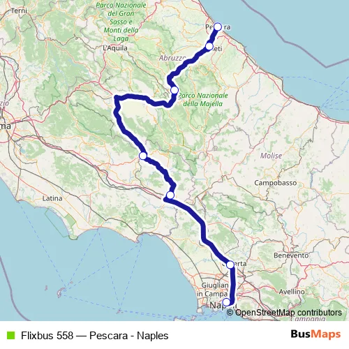 The first stop of the Flixbus 558 bus route is Pescara and the last stop is Naples (FS Park Stazione Centrale). Flixbus 558 (Pescara - Naples) is operational during tutti i giorni.