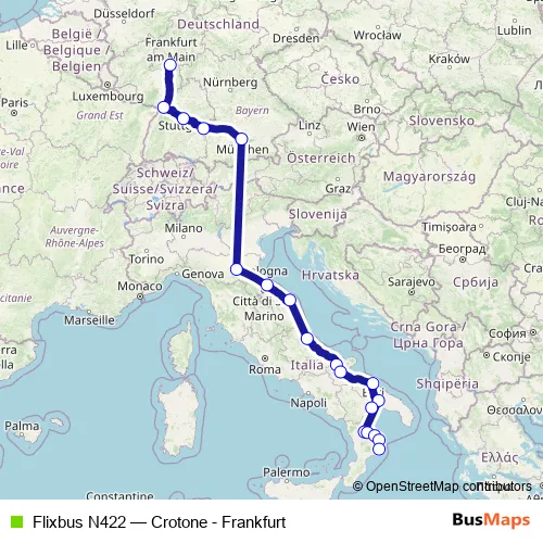 Crotone. Flixbus N422 (Crotone - Frankfurt) is operational during tutti i giorni.