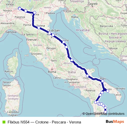 Bus Flixbus N554 - Crotone - Pescara - Verona in Brescia: Stops & Timetable