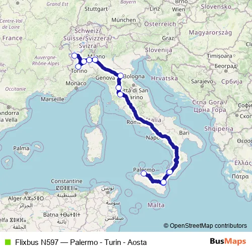 Click here to view the nearest Flixbus N597 - Palermo - Turin - Aosta bus stop.