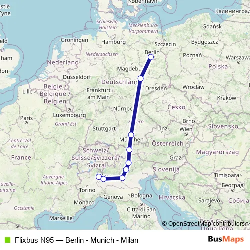 The first stop of the Flixbus N95 bus route is Milan (Malpensa Airport Terminal 1) and the last stop is Berlin central bus station. Flixbus N95 (Berlin - Munich - Milan) is operational during tutti i giorni.