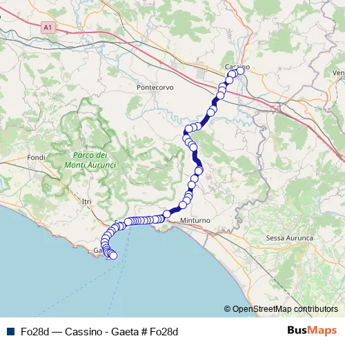 The first stop of the Fo28d bus route is Cassino | Viale Garigliano Via Volturno # f4412 and the last stop is Gaeta | Piazzale Caboto # f4218. Fo28d (Cassino - Gaeta # Fo28d) is operational during tutti i giorni.