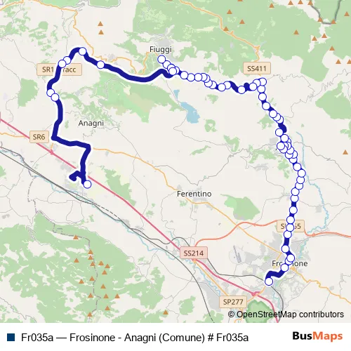 The first stop of the Fr035a bus route is Frosinone | Piazza Pertini # f3486 and the last stop is Anagni | Via Fontana Ceraso # f5121. Fr035a (Frosinone - Anagni (Comune) # Fr035a) is operational during tutti i giorni.