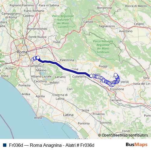 The first stop of the Fr036d bus route is Roma | Anagnina (Metro A) # f3583 and the last stop is Alatri | Ospedale # f4705. Fr036d (Roma Anagnina - Alatri # Fr036d) is operational during tutti i giorni.