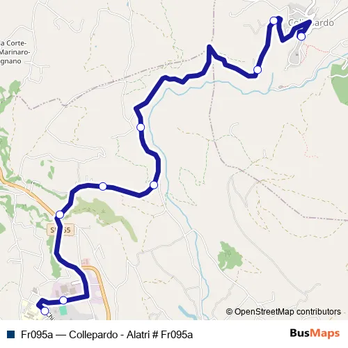 The first stop of the Fr095a bus route is Collepardo | Via Marconi # f4847 and the last stop is Alatri | Ospedale # f4857. Fr095a (Collepardo - Alatri # Fr095a) is operational during tutti i giorni.