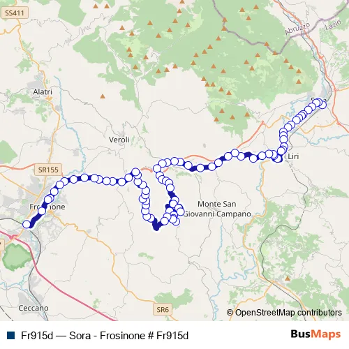 The first stop of the Fr915d bus route is Sora | Stazione FS # f5890 and the last stop is Frosinone | Piazza Pertini # f3486. Fr915d (Sora - Frosinone # Fr915d) is operational during tutti i giorni.